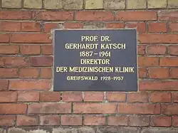 In der Nacht vom 29. zum 30. April 1945 gehörte Gerhardt Katsch, zu dieser Zeit Leiter der Greifswalder Universitätskliniken und dienstältester Sanitätsoffizier in der Stadt, zusammen mit dem damaligen Rektor der Universität Carl Engel und dem stellvertretenden Stadtkommandanten Oberst Max Otto Wurmbach (1885–1946) zu einer Gruppe aus drei Parlamentären, die der anrückenden Roten Armee das Angebot zur Kapitulation und kampflosen Übergabe der Stadt Greifswald überbrachte. Mitte Oktober 1946 erhielt Katsch einen Ruf auf einen geplanten Lehrstuhl für Innere Medizin an der Universität Mainz, den er jedoch rund zwei Wochen später ablehnte.[A 3] Auch eine Berufung an die Charité als Nachfolger seines ehemaligen Lehrers Gustav von Bergmann, der 1946 nach München gewechselt war, war Anfang 1947 von der Universität Berlin geplant. Im Mai 1947 erhielt Katsch nach eigenen Angaben jedoch vom Dekan der dortigen Medizinischen Fakultät eine Absage.[A 4] Zwei Jahre nach Ende des Zweiten Weltkrieges wurde im Schloss Karlsburg im Ort Karlsburg in der Nähe von Greifswald das zweite Diabetiker-Heim unter seiner Zuständigkeit eingerichtet. Das inzwischen zu klein gewordene Heim in Garz blieb als Außenstelle insbesondere für die Betreuung von diabetischen Kindern in den Sommerferien erhalten. 1950 erhielt die Einrichtung in Karlsburg den Namen „Institut für Diabetes-Forschung und Behandlung“, zwei Jahre später wurden die Aktivitäten auch auf die experimentelle Diabetesforschung ausgeweitet. Auf der Insel Rügen wurde 1955 in Sellin die weltweit erste Schule speziell für diabetische Kinder und ein Jahr später ein entsprechendes Ferienlager eingerichtet.[9]