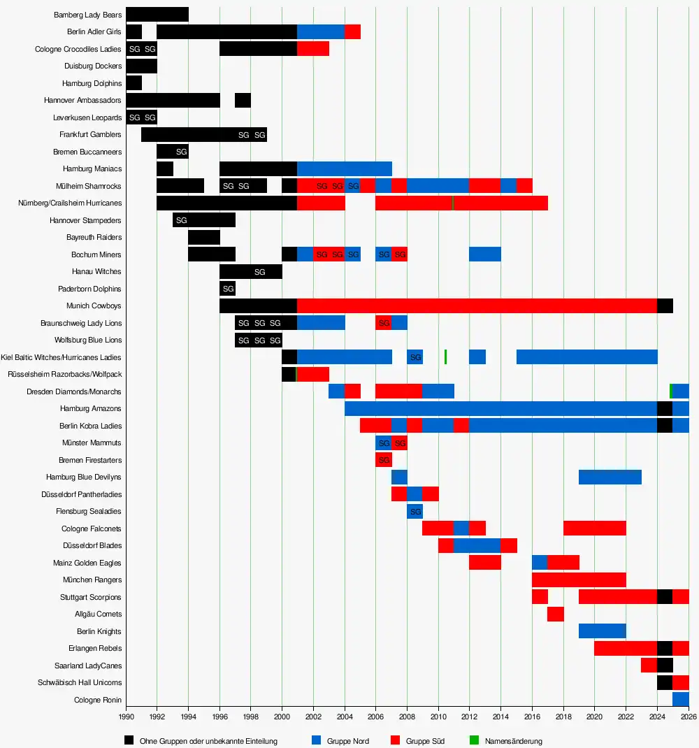 Hinweis: Von 2011 bis einschließlich 2017 wurden die Gruppen mit A und B betitelt; Stand: Saison 2025