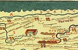 Ausschnitt aus der Tabula Peutingeriana mit Orten und Straßenverbindungen im Bereich der Provinz Niedergermanien. In der Bildmitte oben Agripina (Köln) und Bonnae (Bonn).