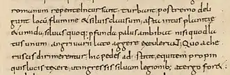 - ↑ zum Beispiel Karl Meister: Der Bericht des Tacitus über die Landung des Germanicus in der Emsmündung. In: Hermes, Band 83 Heft 1, 1955, S. 92–106, hier S. 100. Dass eine entsprechende Interpunktion im Codex mediceus fehlt, steht dieser Auffassung nicht entgegen, denn Satzzeichen fehlen in lateinischen Originaltexten grundsätzlich fast völlig. Die Satzzeichen in den Quelleneditionen sind nachträgliche Einfügungen, um dem modernen Leser die Lektüre zu erleichtern.