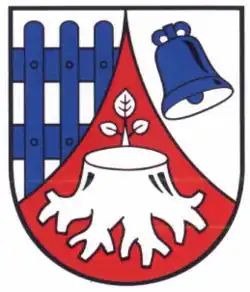 Blasonierung: „In Silber mit eingebogener roter Spitze, die mit einem silbernen Baumstumpf mit austreibendem Zweig belegt ist, vorn ein blaues Zaunfeld mit drei Pfählen und zwei Balken; hinten eine blaue, schrägrechts schwingende Glocke.“