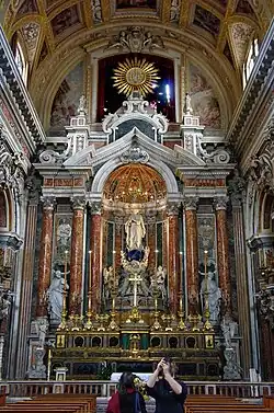 Die Tribüne wurde von Massimo Stanzione freskiert, während Cosimo Fanzago an der Hauptwand eine Architektur aus polychromem Marmor mit sechs Säulen aus Alabaster schuf, in deren Zentrum sich eine Nische mit einer Madonnenstatue von Antonio Busciolano von 1859 befindet. An den Seiten zwei Reliefs aus der Schule des Domenico Antonio Vaccaro mit Darstellungen des Heiligen Ignatius von Loyola und von San Francesco Saverio; darunter zwei Skulpturen der Heiligen Petrus und Paulus, wieder von Busciolano.[6] Die Engelsgruppe, die den Globus trägt, auf dem die Jungfrau steht, stammt aus dem 18. Jahrhundert von einem anonymen Künstler. Der Hochaltar schließlich ist ein Werk des 19. Jahrhunderts und wurde nach Plänen des Jesuiten Ercole Giuseppe Grossi von Raffaele Postiglione realisiert.[6]