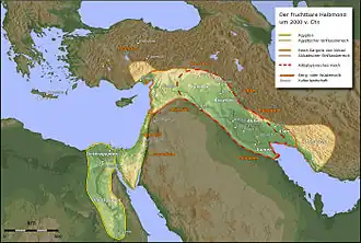 - 3000 v. Chr.: Die vermutlich aus dem Sinai und der Arabischen Halbinsel stammenden Semiten beginnen, sich im Vorderen Orient auszubreiten. Sie dringen ins spätere Palästina und nach Mesopotamien vor, wo die sumerischen Stadtstaaten von den Akkadern erobert werden. Akkade erobert auch das von Sumer unabhängige Reich von Elam. Im Norden Mesopotamiens bilden sie vermutlich einen Großteil der Bevölkerung des gegen 1800 v. Chr. entstehenden altassyrischen Reiches. Zur gleichen Zeit beerbt im Süden das Babylonische Reich die sumerische Dritte Dynastie von Ur.