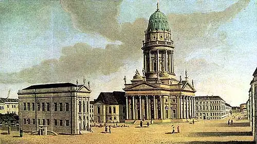 Hatte sich Berlin unter Friedrich II. zur größten Stadt auf dem Gebiet des heutigen Deutschland entwickelt, wurde die Stadt unter Friedrich Wilhelm II. zu einem der führenden Zentren der Klassik. Auf Augenhöhe mit Wien und Weimar wetteiferte die preußische Hauptstadt nun um Künstler, Architekten und Gelehrte.[44] Friedrich II. hatte zwar französische Dichter und italienische Komponisten nach Berlin berufen, aber deutsche Kulturgrößen wie Herder, Goethe oder Mozart ignoriert. Auch war das Theater- und Opernwesen in den letzten Regierungsjahren Friedrichs II. weder architektonisch noch inhaltlich dem Zeitgeschmack angepasst worden. Der Zuschauerraum des Königlichen Opernhauses Unter den Linden musste daher 1787 von dem Oberbaudirektor Carl Gotthard Langhans, dem Architekten des Brandenburgers Tors, umgebaut werden. Auch das Schlosstheater in Charlottenburg wurde unter Friedrich Wilhelm II. erbaut. Das ehemals Französische Komödienhaus am Gendarmenmarkt wurde in das Deutsche Nationaltheater umbenannt, in dem die Stücke erstmals in deutscher Sprache aufgeführt wurden.[45] Eine weitere kulturelle Revolution bestand darin, dass anders als unter Friedrich II. moderne Stücke wie Schillers Don Karlos, Shakespeares Kaufmann von Venedig und Goethes Iphigenie auf Tauris im Nationaltheater gespielt werden durften.[46]