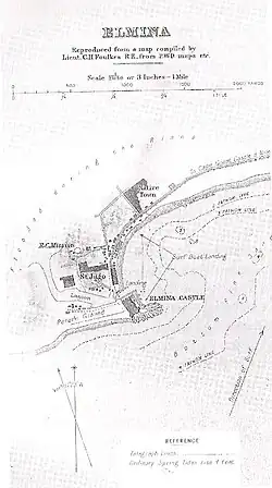 Die afrikanische Siedlung Elmina erstreckte sich unmittelbar von den Mauern der Festung westwärts, beschränkt durch die natürlichen Bedingungen (Lage zwischen Ozean, Lagune und sumpfiger Niederung) und ein Siedlungsverbot, das die Portugiesen nach der Errichtung der Festung für den östlichen Teil der Halbinsel um ihre Burg herum erließen.[20] Die Festung selbst war im Stil mittelalterlicher Burgen gebaut: rechteckig mit Türmen an den vier Ecken.[21] Wahrscheinlich während der 2. Hälfte des 16. Jahrhunderts errichteten die Portugiesen zum Schutz der Stadt eine kanonenbewehrte Mauer, einige hundert Meter westwärts der Festung, die die gesamte Siedlung von der Landseite her schützte. Das von Mauer und Meer bzw. Lagune umschlossene „Stadtgebiet“ von Elmina umfasste also ein Gebiet von etwa drei Hektar.[22]