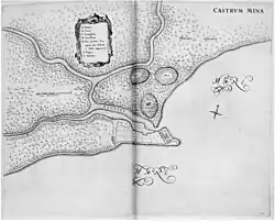Die Einheimischen waren am Handel mit den Portugiesen interessiert und begegneten ihnen freundlich solange der Handel von den portugiesischen Schiffen aus ablief. Der Plan, bei Elmina eine Festung zu errichten, traf jedoch auf Ablehnung. Verhandlungspartner der Portugiesen war ein lokaler Herrscher namens Kwamina Ansa, von den Portugiesen Caramansa genannt. Überliefert ist eine blumige Rede „Caramansas“, die darauf hinauslief, dass „Freunde, die sich gelegentlich sehen, bessere Freunde bleiben, als wenn sie Nachbarn würden.[10]“ Die Portugiesen begannen trotz dieser Ablehnung ihren Festungsbau und legten am 21. Januar 1482 den Grundstein für das spätere Fort São Jorge da Mina. Laut Daaku brannten sie aber wegen dieses Widerstandes den Ort nieder.[11] Die Portugiesen errichteten auf dem erhöht liegenden östlichen Ende der Halbinsel eine rechteckige Festung mit Türmen an jeder Ecke und nannten sie Castelo de São Jorge da Mina, also Festung des heiligen Georgs von Mina, heute bekannt als Elmina Castle. Den Ort selbst nannten sie „El Mina“, also „Die Mine“ und bezogen sich damit auf den Ort als Quelle des Goldes, das sie erhandeln wollten.