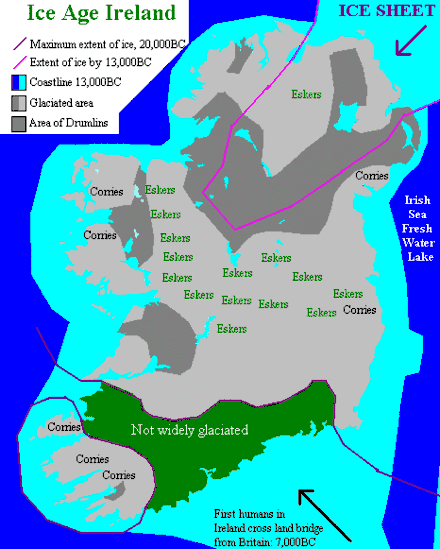 Am Ende der letzten Eiszeit war Nordirland bei einem um etwa 100 m niedrigeren Meeresspiegel über die Landbrücke von der Halbinsel Kintyre mit Schottland und, da die Britischen Inseln damals noch an das europäische Festland angebunden waren, auch mit dem Kontinent verbunden. Mit der Erderwärmung begannen Eiche, Ulme und Esche die Kiefernwälder und die zuvor arktische Flora und Fauna zu verdrängen. Der Riesenhirsch (Megaloceros giganteus) mit einer Geweihauslage von 3,6 m konnte auch in Irland, wo sein letztes Refugium war, nicht überleben. Die Vorgeschichte Irlands beginnt in der Mittelsteinzeit mit der Besiedelung durch kontinentaleuropäische Jäger und Sammler und Fischer.