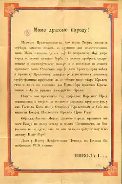 Proklamation zur Wiederbegründung des ersten serbischen Königreichs (Zeile 6) durch König Nikola 1910