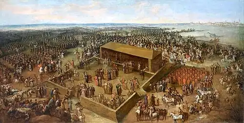 Das Einstimmigkeitsprinzip aller Reichstagsbeschlüsse galt seit dem 16. Jahrhundert, wurde aber erst seit 1652 so angewandt, dass ein einzelner Abgeordneter mit dem Ruf des Liberum Veto das Parlament blockieren und alle bisher gefassten Beschlüsse ungültig machen konnte. Die Problematik dieser Regelungen wurde von vielen erkannt, doch Macht- und gesellschaftliches Desinteresse der Großgrundbesitzer verhinderten Reformen. Die meisten Städte blieben ohne politischen Einfluss und wurden wie die Verteidigung des Landes vernachlässigt, weil der Adel sich weigerte, entsprechende finanzielle Leistungen zur Aufstellung eines schlagkräftigen Heeres aufzubringen. Als Folge der Verweigerung Steuern zu zahlen, blieb die Staatskasse seit der Gründung des gemeinsamen Staatswesens bis zu dessen Untergang, notorisch klamm.[34] Dadurch musste die polnisch-litauische Republik mit kleinen Armeen an mehreren Fronten verteidigt werden. Die Lage des unterdrückten Bauernstandes war aufgrund der Frondienste und persönlicher Unfreiheit schlecht. Kennzeichnend für die politische Entwicklung dieser Zeit ist die Ausbildung einer „Adelsnation“ mit polonisiertem litauischem, ruthenischem und deutsch-preußisch-baltischem Adel, während die Landbevölkerung im Norden und Osten des Landes weiterhin überwiegend deutsch-, litauisch-, weißrussisch- und ukrainischsprachig blieb. Der polnische Reichstag der Magnaten engte nach 1572 die Macht des Königs zunehmend ein und sicherte sich auf Dauer das Privileg der Königswahl.