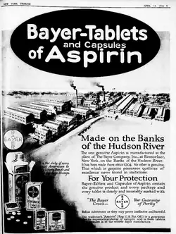 Nach dem Ersten Weltkrieg wurde Bayer im Rahmen des Versailler Vertrags gezwungen, die Rechte an der Marke Aspirin für das Gebiet der Siegermächte USA, Frankreich und Großbritannien aufzugeben. In den USA beschlagnahmte die US-Behörde „Alien Property Custodian“ mit dem US-Kriegseintritt schon 1917 das Pharmaunternehmen. Es wurde zwei Jahre später an Sterling Drug für 5,3 Mio. US-Dollar verkauft, inklusive der Markenrechte und den Namensrechten am Firmennamen incl. des Bayer-Logos.[32] Sterling Drug übernahm auch die kanadischen Vermögenswerte von Bayer sowie das Eigentum an der Marke Aspirin, die in Kanada[33] ebenso wie in weiten Teilen der Welt[34] weiterhin gültig ist. In den USA war der Name „Aspirin“ durch einen Gerichtsbeschluss im Jahr 1921 gemeinfrei geworden wurde.[35]