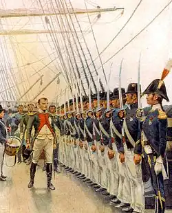 Nach Trafalgar allerdings hatten die Briten die Seehoheit errungen, erneute französische Pläne einer Landung in England oder gar Australien (1804/05) waren nicht mehr realisierbar. Zwar gab es noch immer kampffähige Reste französischer Marineverbände in den verschiedenen, von den Briten blockierten Kriegshäfen, und immer wieder gelang es einigen Schiffen auch, die britische Blockade zu durchbrechen (so z. B. dem Freibeuter Robert Surcouf aus St. Malo), doch ohne den Schutz einer starken Flotte fielen alle französischen Überseekolonien in britische Hände. Allein im Seegefecht von Grand Port vor Mauritius gelang den Franzosen unter Admiral Duperré 1810 noch ein kleiner Sieg über die Briten, ohne letztlich den Verlust auch dieser Kolonie verhindern zu können. Napoleon gab jedoch seine Seekriegspläne nicht auf. Im Sommer 1810 gründete er den Marinerat und erarbeitete mit den Admirälen Decrès und Ganteaume und den Staatsräten Malouet und Caffarelli ein riesiges Flottenrüstungsprogramm. Innerhalb von eineinhalb Jahren, von 1810 bis 1812, stieg die Zahl der Linienschiffe des gesamten Kaiserreichs von 50 auf 72. Da es schwieriger war, die menschlichen Verluste auszugleichen, begann man, die Militärkonskription auch in den Dienst der Marine zu stellen und massiv Seeleute aus verbündeten oder abhängigen europäischen Staaten zwangsweise zu rekrutieren.[37] Eine neue französische Mittelmeerflotte konnte noch 1813 einen britischen Angriff auf Toulon abschlagen, jedoch nicht mehr die britische Blockade durchbrechen.