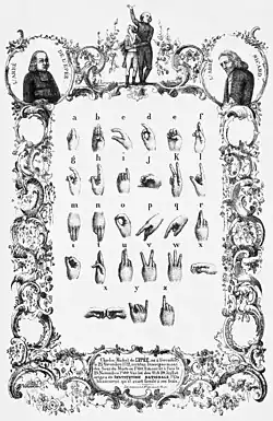 - ↑ J. Hay und R. Lee: Eine bildliche Geschichte der Entwicklung des britischen manuellen Alphabets (englisch). In: Deafness and Education. vol. 21, 1997.