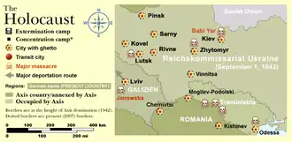 Nach dem deutschen Überfall auf die Sowjetunion im Juni 1941 fanden in vielen Gebieten der Ukraine Massaker und Pogrome an Juden durch Ukrainer statt. Mit dem Vorrücken der SS-Einsatzgruppen begannen die massenhaften Erschießungen von Juden durch diese Einsatzgruppen. Das bekannteste dieser Massaker fand am 29. und 30. September 1941 in Babyn Jar statt, wo mehr als 33.000 jüdische Kiewer ermordet wurden, gefolgt von weiteren regelmäßigen Massenerschießungen mit weiteren etwa 70.000 Toten. Weitere Massaker gab es in Charkiw, in Berditschew, in Kamenez-Podolsk und an vielen anderen Orten.