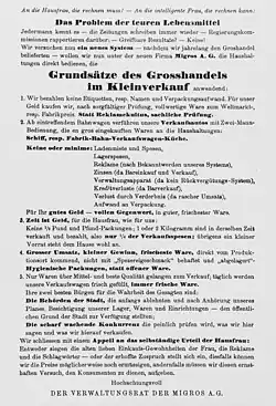 Dem Kaufmann Gottlieb Duttweiler fielen Mitte der 1920er Jahre die grossen Preisunterschiede zwischen Gross- und Detailhandel auf. Er fand heraus, dass die Schweizer Lebensmittelpreise innerhalb weniger Jahre stark angestiegen und mittlerweile die höchsten Europas waren. Gründe dafür waren die Zersplitterung des Detailhandels in unzählige Kleinunternehmen mit geringem Umsatz, zu teure Ladeneinrichtungen und -mieten, Verderb der Lebensmittel durch zu lange Lagerung, hohe Spesen durch Rabattsysteme und kleine Bezugsmengen, Preisvorschriften von Markenartikelherstellern, aufwändiges Abwägen und Verpacken kleinster Mengen, hoher Werbeaufwand sowie das Anschreibenlassen.[2] Duttweilers Meinung nach war nur die konsequente Anwendung der Prinzipien des Fordismus und Taylorismus imstande, die Kosten für Endverbraucher nachhaltig zu senken: Grosser Umsatz bei kleiner Gewinnmarge, Dienst am Konsumenten, dessen Beteiligung am Vorteil des steigendem Umsatzes durch Verbilligung der Ware, Typisierung der Artikel, kleine Lagerbestände und grösstmögliche Ausnützung der Arbeitsstunden. Unerlässlich für das Erreichen dieser Ziele waren die Ausschaltung des Zwischenhandels, die Rationalisierung des Verkaufs und der Verzicht auf Markenartikel.[3]
