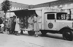 Lange Zeit hatte die Migros bei der Expansion ins Ausland wenig Erfolg. Gottlieb Duttweiler beteiligte sich im Januar 1932 als Privatperson an der Migros-Verteilungs-GmbH in Berlin. Eine Vereinbarung legte fest, dass sie zwar unter dem Namen Migros handeln konnte, aber die Schweizer Migros AG keinerlei finanzielle Verpflichtungen übernahm. Ab Juni 1932 bedienten 76 Verkaufswagen mehr als 2000 Haltestellen im gesamten Berliner Stadtgebiet.[118] Der krisengeschüttelte Detailhandel in der deutschen Hauptstadt reagierte ungehalten auf die ausländische Konkurrenz. Nach der Machtergreifung der NSDAP im Januar 1933 überzogen die Behörden das Unternehmen mit bürokratischen Schikanen und Mitglieder des Nationalsozialistischen Kampfbundes für den gewerblichen Mittelstand bedrohten die Kunden. Schliesslich erwiesen sich die Hindernisse als zu gross, weshalb die Gesellschafter im Herbst 1933 die Einstellung der Geschäftstätigkeit und die Liquidation beschlossen.[119]