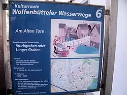 Der Artikel behandelt den heutigen Verlauf der Oker sowie das historische Grabensystem, auf das die zahlreichen Informationstafeln des städtischen Projektes Wolfenbütteler Wasserwege hinweisen.[1]