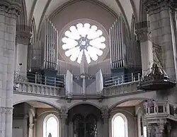 Beispiele:[22] Schlägl (Andreas Butz / Johann Christoph Egedacher, 1634/1708), Klosterneuburg (Johann Georg Freundt, 1642), Rheinau (Johann Christoph Leo, 1715),[61] Kloster St. Urban (Josef Bossart, 1721),[62] Zwettl (Johann Ignaz Egedacher, 1731), Fürstenfeld (Johann Georg Fux, 1736), Maihingen (Johann Martin Baumeister, 1737),[63] Herrenbach (Augsburg) (Georg Friedrich Schmahl, 1737),[64] Wien (Michaelerkirche) (Gottfried Sonnholz, 1742), Weingarten (Joseph Gabler, 1750), Bad Wimpfen (Johann Adam Ehrlich, 1752), Herzogenburg (Johann Hencke, 1752), Mediasch (Johannes Hahn, 1755), Maria Limbach (Johann Philipp Seuffert, 1756), Völs am Schlern (Ignaz Franz Wörle, 1760), Ottobeuren (Karl Joseph Riepp, 1766), Habsberg (Johann Conrad Funtsch, 1767), Benediktbeuern (Andreas Jäger (Orgelbauer), 1770), Maria Dreieichen (Anton Pfliegler, 1780), Rot an der Rot (Johann Nepomuk Holzhey, 1793), Bistritz (Johannes Prause, 1795),[65] Herz Jesu (Velburg); (Wilhelm Hepp, 1803).