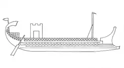 Corvus: Im zweiten Buch seiner römischen Geschichte (Pragmateia) beschreibt Polybius den corvus als eine Brücke, die 1,2 Meter breit und 10,9 Meter lang war, mit einer schmalen Brüstung an beiden Seiten. Die Vorrichtung wurde vermutlich im Bug des Schiffes benutzt, wo ein System von Seilzügen es erlaubte, die Brücke hinauf- und herunterzufahren. Am anderen Ende des Geräts, unter der Brücke, war ein schwerer, wie ein Schnabel geformter Dorn (daher der Name), der sich in der Beplankung an Deck des gegnerischen Schiffes festfressen sollte, wenn der corvus von römischer Seite her herabgelassen wurde. Das System schuf eine feste Verbindung zwischen den Schiffen und gab den Legionären die Möglichkeit, auf die gegnerische Seite hinüber zu gehen.