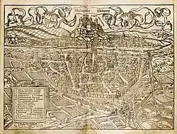 In den Wirren der Reformation lag der Schwerpunkt der Sicherheitspolitik der Fürstbischöfe auf der Bündnispolitik. So hatte Julius Echter 1609 die Katholische Liga mitbegründet.[56] Deshalb wurden die Befestigungsanlagen der Stadt und des Schlosses (heute Festung genannt), die noch aus dem Mittelalter stammten und nicht mehr dem neuesten Stand entsprachen, nur langsam ausgebaut.[56] So war es für König Gustav II. Adolf von Schweden leicht, im Dreißigjährigen Krieg (nachdem er am 13. Oktober im Schloss von Unterpleichfeld übernachtet hat und seine Soldaten bereits an diesem Tag umliegende Dörfer geplündert haben[62]) am 14./15. Oktober 1631 die Stadt Würzburg zu erobern. Die Grenzfestung des Hochstifts Königshofen wurde bereits am 10. Oktober eingenommen, als die Schweden von Erfurt nach Franken kamen. Im Morgengrauen des 14. Oktober erschien die Vorhut auf dem Greinberg nordöstlich von Würzburg. Ein Trompeter der schwedischen Truppen verlangte die Übergabe der Stadt, andernfalls würde Würzburg für die Zerstörung Magdeburgs durch die Liga verwüstet. Dazu sprengten die Schweden das Galgentor, plünderten die Vorstadt und steckten über 20 Gebäude in Brand. Um eine Zerstörung zu vermeiden, willigte der Stadtrat in die Kapitulation ein. Am 15. Oktober rückte die schwedische Armee durch das Spitaltor in die innere Stadt ein.[56] Am 16. und 17. Oktober ließ der König das Schloss Marienberg erstürmen, auf dem sich unter dem bayrischen Rittmeister Adam Heinrich Keller von Schleitheim 600 Söldner verschanzten. In einem Blutbad wurden 700 Menschen getötet, darunter viele Zivilisten und Geistliche, wie die Kapuziner Leopold von Gumppenberg, Guardian des Kapuzinerklosters Würzburg, und Simon Elperle. Der kurz zuvor gewählte Fürstbischof Franz von Hatzfeld floh bereits einige Tage zuvor am 11. Oktober mit den Spitzen der geistlichen und weltlichen Verwaltung aus dem Schloss nach Mainz.[56] Bei der Erstürmung wurden viele der Bücher aus der von Julius Echter ausgebauten Hofbibliothek nach Uppsala in Schweden verschafft, um in die dortige Universität eingegliedert zu werden. Ähnlich wurde bei den Bibliotheken der Würzburger Kollegien und der Würzburger Universität verfahren. Am 19. November 1631 zog die Hauptarmee aus Würzburg ab. Vom Abzug der Armee an musste die Stadt alle zehn Tage eine Geldzahlung in Höhe von 1000 Reichstalern leisten. Infolge von Zahlungen in Höhe von 80.000 Reichstalern Anfang sowie 10.000 Reichstalern im September 1634 und weiteren Leistungen an die Schweden verarmte die Stadtbevölkerung mehr und mehr.[56]