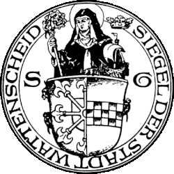 Das älteste Siegel für Wattenscheid ist für das Jahr 1477 belegt. Es zeigt die heilige Gertrudis, Schirmheilige des Kirchspieles und Stadtpatronin als Halterin des Wappenschildes der Landesherren von Kleve und Mark.[10] Ab 1554 war Wattenscheid Mitglied der Hanse.[1] Allerdings war sie nur eine Beistadt, die zwar von Handelsprivilegien profitieren konnte, aber innerhalb der Hanse nicht mitsprechen konnte. Seit 1549 nahm Hamm die Rolle einer Prinzipalstadt für die märkischen Städte an und vertrat die kleine Ortschaft.[12]
