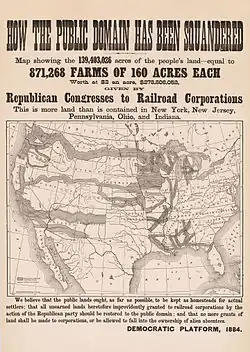 Einen erheblichen Einfluss auf die zunehmende Besiedlung des Westens hatte auch der „Homestead Act“ von 1862, der Land in Staatsbesitz kostenlos an Niederlassungswillige übertrug. Beschleunigt wurde die Erschließung durch den Bau der Eisenbahnen vom Mittleren Westen nach Kalifornien ab 1862 (siehe Geschichte der Eisenbahn in Nordamerika). Das amerikanische Schienennetz wuchs dadurch insgesamt zwischen 1870 und der Jahrhundertwende von 53.000 auf 200.000 Meilen. Damit war es länger als alle Bahnstrecken der restlichen Welt insgesamt.[11] Dieser Prozess der kontinentalen Ausdehnung der USA fand seinen Ausdruck auch darin, dass sich neue Bundesstaaten bildeten und in die Union aufgenommen wurden: Texas (1845), Iowa (1846), Wisconsin (1848), Kalifornien (1850), Minnesota (1858), Oregon (1859), Washington (1889) und weitere. 1867 kauften die USA Alaska für 7,2 Millionen Dollar (in Gold) von Russland. Als Abschluss der Ära der Erschließung des Westens gilt das Ende der Indianerkriege (1890). Die letzte Inbesitznahme von Land durch angloamerikanische Siedler fand zwischen 1889 und 1895 in Oklahoma statt, wo nacheinander die „Unassigned Lands“, mehrere Indianerreservate und der Cherokee Outlet durch „Land Runs“ geöffnet wurden. Beim Zensus 1900 wurden weniger als 240.000 Indianer verzeichnet. Die Native Americans hatten ihre kulturelle Identität weitgehend verloren. Ihre Existenz hing vom guten Willen der Bundesregierung und privaten Spenden ab.[12] Die frontier wurde nach dem Census-Bericht von 1890 für geschlossen erklärt. Dieser Census belegte, dass es keine durchgehende Siedlungsgrenze in den USA mehr gab – die USA waren vollständig erschlossen.