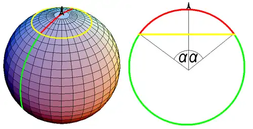Bertrands Kugelparadoxon: Wie groß ist die Wahrscheinlichkeit, dass der Zufallspunkt oberhalb der gelben Linie (links) landet? Nach Bertrand entspricht sie dem Verhältnis der Länge der roten Linie (rechts) zur Länge des gesamten grünen Großkreises oder α/180°.