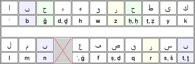 Dort werden die arabischen Buchstaben in der traditionellen Abdschad-Anordnung aufgelistet, sind jedoch, der Einfachheit halber, in der heutigen Form dargestellt. Buchstaben mit demselben Graphem sind mit farbigem Hintergrund markiert. Der zweite Lautwert eines Buchstabens, der mehr als ein Phonem ausdrückt, folgt nach dem Komma. In dieser Tabelle steht das ǧ für englisches j (dsch) wie z. B. in „June“.