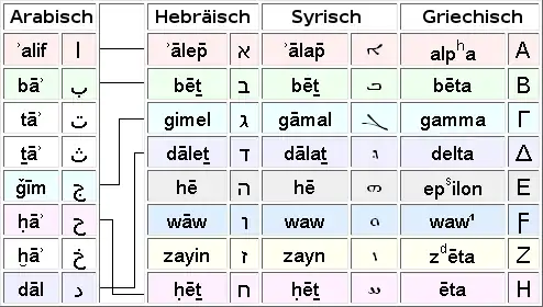 Das arabische Alphabet entwickelte sich entweder aus dem nabatäischen oder (gilt als unwahrscheinlicher) aus dem syrischen Alphabet. Die Tabelle veranschaulicht die Veränderungen der Buchstaben ausgehend vom aramäischen Original hin zur nabatäischen und syrischen Form. Arabisch ist mittig angeordnet, also nicht chronologisch zur Sprachentwicklung.