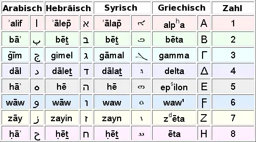 (Anmerkung: mit numerischer Reihenfolge ist hier die ursprüngliche Buchstabenreihenfolge gemeint, wenn sie als Zahlenwerte verwendet werden. Siehe auch indisch-arabische Zahlen, griechische Zahlen und hebräische Zahlen.)