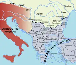 454 besiegte ein Bund der Gepiden unter deren König Ardarich in der Schlacht am Nedao ein Heer der Hunnen. Daraufhin erhielt der ostgotische König Valamir vom oströmischen Kaiser die Erlaubnis sich in Pannonien anzusiedeln.[3] Thiudimir, der Bruder des Königs Valamir, nahm seinen Sitz am Pelsodsee (Neusiedler See) und herrschte hier relativ selbständig über einen Landesteil.[6] Zwischen 451 und 456 wurde Thiudimir und seiner Konkubine Ereleuva am Neusiedler See ein Sohn geboren, der später als Theoderich der Große König der Ostgoten wurde und heute als eine der bedeutendsten Persönlichkeiten der Völkerwanderungszeit gilt.[7]