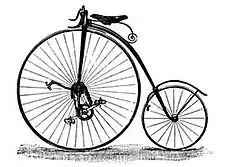 Die Compagnie Parisienne der Brüder Olivier (nach der Übernahme von Michaux), die heftig für den neuen Sport der jungen Männer warben, baute 1867 ein verändertes Rad mit schmiedeeisernem Rahmen in Serie, mit 40 kg doppelt so schwer wie die Laufmaschine. Durch Verdrillen des drehbar gelagerten Lenkers wurde über eine Bremsschnur die Schleifbremse am Hinterrad betätigt.[44] Der Sattel war nun so hoch, dass man den Boden mit den Füßen nicht mehr erreichte. Zum Aufsteigen nahm man einen Anlauf und grätschte dann auf den Sattel, oder jemand musste das Veloziped halten. Erst später gab es eine Fußraste zum Aufsteigen. Ein Pedal konnte man dazu nicht nehmen, da die Pedalkurbel ja mit dem Vorderrad starr verbunden war. Rennen wurden gefahren, erste handgeschliffene Kugellager benutzt. Die Pariser Nachfrage wurde auch durch britische Firmen in Coventry beliefert. In den USA gab es einen kurzen Boom mit über hundert Patenten. In Deutschland gab es ab 1868 mindestens 37 Hersteller, darunter so bekannte Namen wie Heinrich Büssing, der später ein Omnibuswerk gründete.[45] 1869 wurde erstmals ein Kugellager in der Radachse verwendet, davor hatte man Gleitlager aus Bronzeguss. Die Hanlon Brothers ergänzten Schutzbleche, eine handbedienbare Vorderradbremse und eine Begrenzung des Lenkeinschlags.[46]