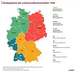 Drahtfunk (Rundfunk) im amerikanischen Sektor (DIAS/RIAS) mit Sitz in West-Berlin 1946 Hessischer Rundfunk (HR) mit Sitz in Frankfurt am Main 1948 Süddeutscher Rundfunk (SDR) mit Sitz in Stuttgart 1949 Bayerischer Rundfunk (BR) mit Sitz in München 1949 |