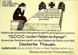 Im Ersten Weltkrieg (1914–1918) wollten die deutschen Juden ihren Patriotismus beweisen, wie bereits zuvor im Feldzug Preußens und Österreichs gegen Dänemark im Jahre 1864, im Preußisch-Österreichischen Krieg von 1866 und im Deutsch-Französischen Krieg 1870/71, wo etwa 14.000 jüdische Soldaten auf preußisch-deutscher Seite im Feld standen.[56] Doch antisemitische Hetze und Propaganda machten sie später zu Sündenböcken für den verlorenen Ersten Weltkrieg.