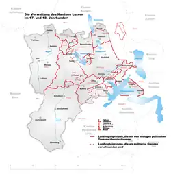 Seit dem 13. Jahrhundert hatten in der Stadt ansässige Ministerialen und Bürger Herrschaftslehen im Umkreis Luzerns inne. 1380 setzte mit dem Erwerb von Weggis eine eigentliche städtische Territorialpolitik ein, die mit den Erwerbungen im Sempacherkrieg (1386), der Übernahme des Amtes Willisau (1407) und der Eroberung des Aargaus (1415) die grössten Schübe erlebte. Bis um 1480 nahm die Stadt die letzten um Luzern gelegenen Vogteien, die bis anhin Privatbesitz einzelner Bürgerfamilien gewesen waren, in ihre eigenen Hände. 1579 folgte noch Knutwil, und 1803 erreichte der Kanton mit dem Tausch des Amtes Merenschwand (Aargau) gegen das Amt Hitzkirch seine heutige Ausdehnung. Das Staatsgebiet umfasste vor 1798 neben Stadt und Amt Luzern die beiden Landstädte Sempach und Sursee, welche innerhalb der Luzerner Landeshoheit relativ autonom blieben, die grossen, von Kleinräten regierten Landvogteien Willisau, Rothenburg, Entlebuch, Ruswil und Michelsamt, die kleinen, von Grossräten verwalteten Ämter Habsburg, Merenschwand, Büron/Triengen, Malters/Littau, Kriens/Horw, Weggis, Knutwil und Ebikon, ferner die Schlossvogtei Wikon und die Seevogtei Sempach.