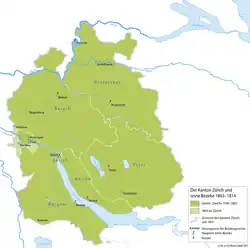 Das Gebiet des Kantons Zürich bildete nun einen Wahl-, Gerichts- und Verwaltungsbezirk der zentralistisch aufgebauten Helvetischen Republik. Gemäss der Verfassung wurde der Kanton neu organisiert. Es wurden 15 Distrikte gebildet (Horgen, Mettmenstetten, Zürich, Regensdorf, Bassersdorf, Bülach, Uster, Fehraltorf, Grüningen, Wald, Elgg, Andelfingen, Benken, Meilen und Winterthur) und die Grenzen mit den Nachbarkantonen bereinigt. Zürich trat Stein am Rhein, Hemishofen, Ramsen und Dörflingen an den Kanton Schaffhausen ab. Rheinau und Urdorf kamen neu zum Kanton Zürich, während das Kloster Fahr, Dietikon, Unteroetwil, Hüttikon und Schlieren dem Kanton Baden zugeteilt wurden. Ebenfalls verlor Zürich die Exklaven Pfyn, Wellenberg, Weinfelden sowie Sax-Forstegg an die Kantone Thurgau bzw. Linth. Mit den Kantonen Baden und Thurgau fanden auch Bereinigungen im Fall geteilter Herrschaftsrechte in den Grenzbereichen statt. So kam etwa das Kelleramt an Baden, Hüttwilen, Nussbaumen, Neunforn an Thurgau, während Stammheim und Ellikon an Zürich gingen.[17]