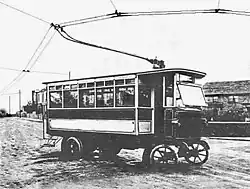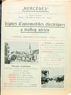 Weitere technische Neuerungen waren die Verwendung von Vollgummireifen statt eisenbereifter Holzspeichenräder. Darüber hinaus stand – erstmals im regelmäßigen Fahrgastbetrieb – bei zwei der Mercédès-Électrique-Stoll-Anlagen jeder Fahrtrichtung ein Fahrleitungspaar zur Verfügung, von Stoll als Vierdrahtsystem bezeichnet. Die Bauart Mercédès-Électrique-Stoll war vergleichsweise stark verbreitet, es bestanden insgesamt 18 Anlagen nach diesem System.[27] Eine 1912 geplante Strecke in München, sie sollte von Neuhausen nach Sendling führen, konnte hingegen nicht mehr verwirklicht werden:[4]
