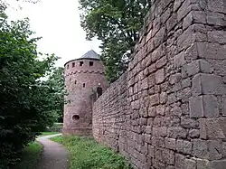 In diese Zeit fallen vermutlich der Bau der Gaugrafenburgen von Saarbrücken, St. Ingbert (Stiefler Schloss) und Altfelsberg. Die Burg Homburg wurde spätestens bis 950 errichtet. Auf einer Burg bei St. Wendel, das damals noch „Basenvillare“ hieß, soll im Jahr 950 ein Zusammentreffen von König Otto I. und dem westfränkischen König Ludwig IV. stattgefunden haben.[35] Die Reichsburg Kirkel wird erstmals Ende des 11. Jahrhunderts erwähnt. Alle diese Burganlagen spielten für mehrere Jahrhunderte in der Geschichte des Saarlandes eine bedeutende Rolle.