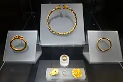 Im 2. Jahrtausend v. Chr. entwickelte sich im Saarland eine Kultur der Metallbearbeitung. Davon zeugen Depotfunde mit Bronzeäxten, Beilen, Schwertern, Trensen und Schmuck, die in der Mitte des 19. Jahrhunderts bei Straßenbauarbeiten an der mittleren Saar entdeckt wurden. Bei St. Barbara fand man eine Kupfermine. Im Jahr 2007 entdeckte man in Erfweiler-Ehlingen einen spätbronzezeitlichen Schatz, der wohl wegen einer kriegerischen Bedrohung im Boden versteckt worden war. Mehrere Grabhügel im Saarland geben Zeugnis von der sozialen Herausgehobenheit der Bestatteten und deuten auf eine Elite in der Region hin. Durch die Verteilung von Grabfunden zeigen sich Siedlungsschwerpunkte an der Saar und an der Blies, die einen günstigen Ackerbau ermöglichten. Namen und Sprache der damaligen Bewohner des Saarlandes sind bisher unbekannt.[9]
