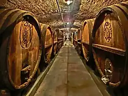 Für die Lagerung der Ernten entstand eine Keller-Infrastruktur. In Münsterschwarzach selbst bestanden zwei Weinkeller, in denen etwa 12 große Weinfässer untergebracht waren. Daneben unterhielt das Kloster eine Weinkellerei in Nordheim am Main. Im größten Weinkeller des Klosters unterhalb des ab 1688 erweiterten Zehnthofes konnte Wein in der Menge von ca. 3.732 Hektolitern gelagert werden. Hinzu kam die beiden Weinkeller in Sommerach (ca. 2.200 Hektoliter um 1680) und Stadelschwarzach (Fläche ca. 170 m²). Insgesamt konnten in den Kellern also 1,3 Millionen Liter Wein gelagert werden.[24]