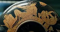 Zum Befüllen der Transportgefäße verwendete man Kellen oder Gefäßformen wie den Kyathos. Zum Transport und Einschenken wurden Kannen, so Oinochoen oder Olpen, benutzt. Als Trinkgefäß dienten der Skyphos, der Kantharos sowie die zeitweise sehr populäre Trinkschale Kylix. In manchen Regionen bildeten sich Sonderformen als Trinkgefäß heraus, in Lakonien etwa war die Lakaina besonders beliebt.[2] Mit ihrer Trink- und Gelagekultur hatten die Griechen großen Einfluss auf andere mediterrane Gebiete, vor allem die Etrusker orientierten sich sehr an der griechischen Trinkkultur.