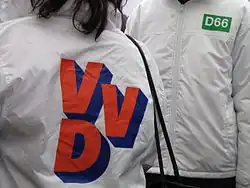 Neben der Partij van de Arbeid war die Partij van de Vrijheid, die frühere Liberale Staatspartij, erstanden. 1947/1948 vereinigte Oud seine Anhänger mit der PvdV zur Volkspartij voor Vrijheid en Democratie.[40] Diese Partei hat einen eher linkeren, sozialliberalen, und einen rechteren, nationalliberalen Flügel. In der Mitte der 1970er Jahre startete sie ihren Höhenflug von einer um die zehn Prozent angesiedelten Partei zu den 24,7 Prozent im Jahre 1998. Neben den Christdemokraten sind die Liberalen die Partei mit der meisten Regierungserfahrung in den Niederlanden. Nach 2000 verlor die VVD mit Geert Wilders und Rita Verdonk ein Fraktionsmitglied bzw. eine ehemalige Ministerin, die mit eigenen rechtspopulistischen Parteien weitermachen (Partij voor de Vrijheid und Trots op Nederland).