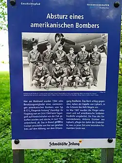 Am 24. April 1944 wurde ein amerikanischer B-17-Bomber (engl. Flying Fortress/Fliegende Festung) während eines Angriffs auf Friedrichshafen von einem Flakgeschütz getroffen und stürzte ab: das brennende Cockpit zerschellte vor dem Riedheimer Ortseingang, der Rumpf fiel neben der Lipbacher Kapelle in eine Scheune. Die zehn Besatzungsmitglieder wurden hier in der Nähe der Informationstafel beerdigt, im Mai 1947 exhumiert und auf amerikanische Soldatenfriedhöfe umgelegt.