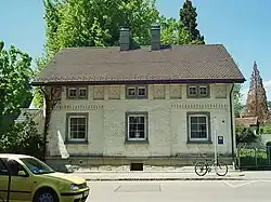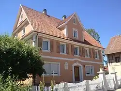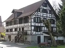 Das zweistöckige Fachwerkhaus wurde um 1700 im Linzgau-Stil erbaut und ist mit zahlreichen Zierformen wie Rauten, Andreaskreuzen und V-Streben ausgestattet.