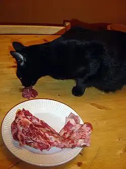 Katzen weisen – ähnlich wie Hunde – aminosäuresensible Rezeptoren auf. Diese werden durch einige Aminosäuren (z. B. L-Lysin) stimuliert, durch andere – vom Menschen als bitter empfundene Aminosäuren wie L-Tryptophan – jedoch gehemmt, was zum Abweisen des entsprechenden Futterbestandteils führt. Ungewöhnlich für Säugetiere ist eine komplette Unempfindlichkeit für süßen Geschmack durch eine Deletion im Gen Tas1r2.[33] Saures nehmen Katzen ähnlich wie Hunde wahr. Anstelle der für die Wahrnehmung des „fruchtig-süßen“ Geschmacks bei Hunden vorhandenen Rezeptoren reagieren Katzen mit einem weiteren Rezeptortyp auf Bitterstoffe wie Chinin, Tannine und Alkaloide.[34]