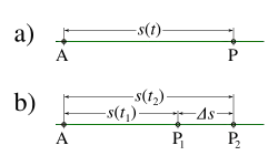Bewegt sich ein Objekt entlang einer Bahnkurve, wobei es sich zum Zeitpunkt im Punkt und zu einem späteren Zeitpunkt im Punkt befindet, so ergibt sich seine Geschwindigkeit zum Zeitpunkt (bzw. im Punkt ) näherungsweise aus der Ortsänderung und der dafür benötigten Zeitspanne gemäß