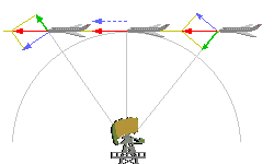 Vorbeifliegendes Flugzeug mit Geschwindigkeit (rot), Radialgeschwindigkeit (grün) und Tangentialgeschwindigkeit (blau)