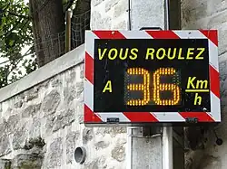 Im Gegensatz zu den Überwachungsanlagen, die der Verfolgung von Ordnungswidrigkeiten dienen, hat eine Geschwindigkeitsanzeigeanlage (kurz: GAA) keine Kamera und keine Kennzeichenaufzeichnung.[19] Die Werbung nennt diese Produkte Aktive Verkehrserziehung. Die Anlage besteht aus einer eingebauten Radaranlage, der Auswerteelektronik und einer LED-Anzeige, optional kann eine Solaranlage zur Energieversorgung vorhanden sein.