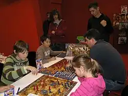 In den USA wurden kommerzielle Gesellschaftsspiele ab der zweiten Hälfte des 19. Jahrhunderts durch Verlage wie Parker und Milton Bradley (MB) vermarktet.[12][13] In großer Stückzahl hergestellt wurde ab 1935 der Klassiker Monopoly, der sich an ein 1904 patentiertes Vorbild The Landlord’s Game anlehnte. Ein bedeutender Impuls ging von Spielen aus, die ab etwa 1960 veröffentlicht wurden, darunter Risiko (Risk, 1959), das The Game of Life (Das Spiel des Lebens) und im Rahmen der 3M-Spieledition Spiele wie Acquire und TwixT.[14] Die Autoren der beiden letztgenannten Spiele, Sid Sackson bzw. Alex Randolph, hatten in den folgenden Jahrzehnten einen maßgeblichen Einfluss auf die weitere Entwicklung von Gesellschaftsspielen, insbesondere auch in Deutschland, mit Titeln wie Sleuth, Focus, Can't Stop und Metropolis bzw. Sagaland, Hol's der Geier, Inkognito und Geister.
