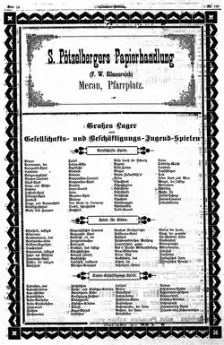 Liste von Gesellschaftsspielen aus der Meraner Zeitung vom 13. November 1903, Inserat der Buchhandlung Pötzelberger-Ellmenreich