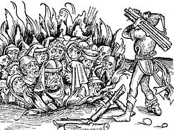 - ↑ Schedel erwähnt die Ereignisse von 1421 nicht. Der Holzschnitt wird dreimal verwendet und illustriert Ereignisse aus den Jahren 1298, 1337 und 1492, bei denen das öde jamerig und trostlose volck der iuden … verprennt worden ist; in zwei Fällen lautete die Anklage auf Hostienfrevel.
